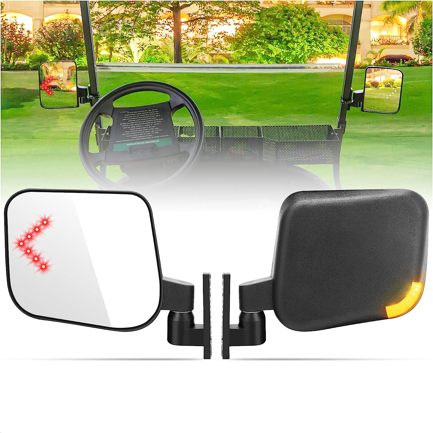 - Blinker Light - This golf cart rearview mirror has turn signal LED lights in both front & back of the mirror, making vehicles, both in front of and behind you, aware that you are turning. And the lights in the mirror will blink synchronously with the headlights & tail lights, your golf cart must be drilled & equipped with headlights to attach this side mirror kit to your cart directly.